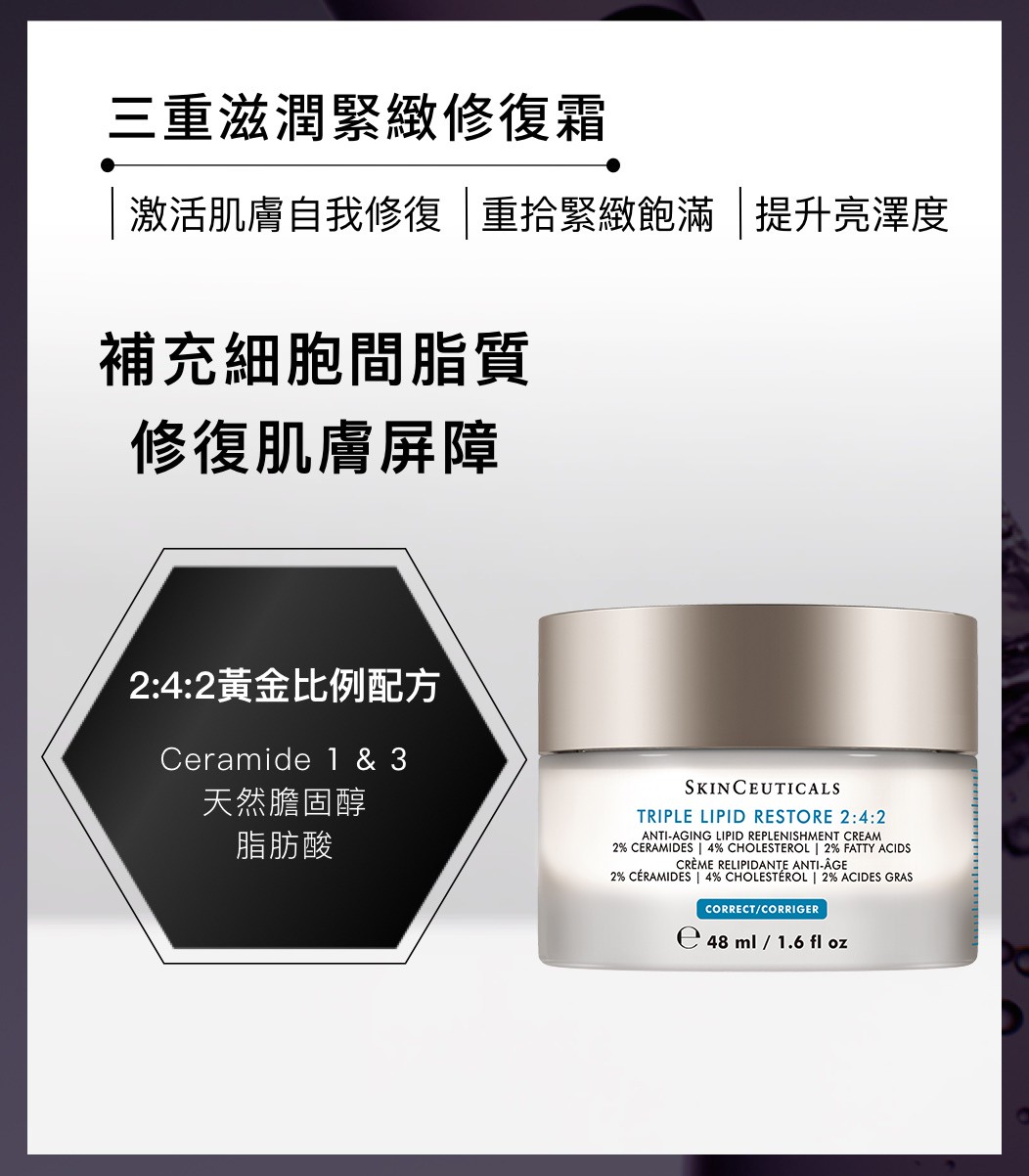 三重滋潤緊緻修復霜首創2:4:2 天然脂質修復配方,由2%神經醯胺,4%天然膽固醇及2%脂肪酸的黃金比例調製而成,確保脂質成份能發揮其更大功效。有助配方修復皮膚天然防禦機能,激活皮膚自我修復及補充養份,改善加速衰老跡象。經臨床測試,有效改善皮膚幼滑度、彈性、毛孔及光澤度。