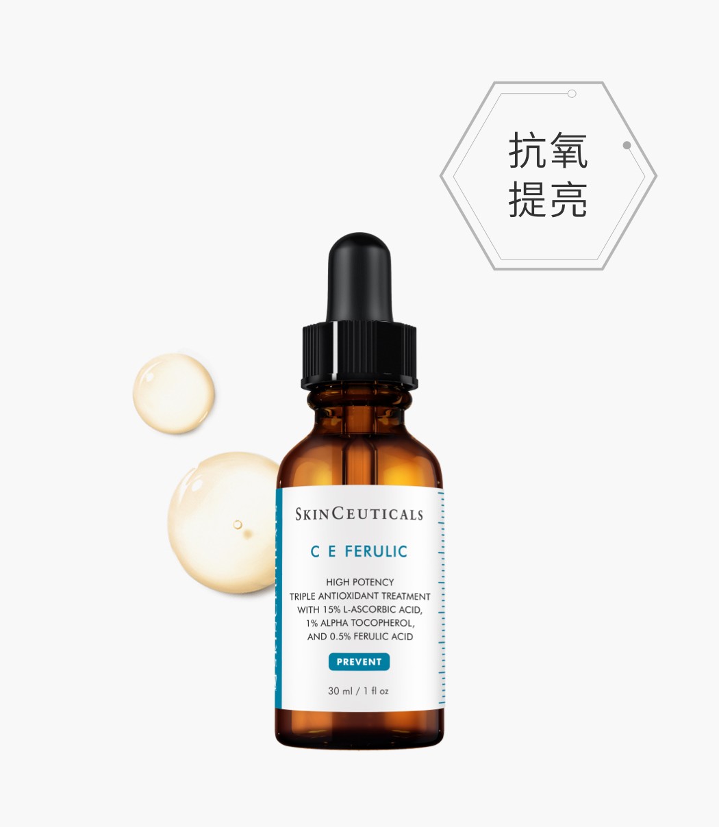 濃縮維他命C E FERULIC精華以卓越抗氧化配方,中和自由基,促進膠原蛋白合成及提供高效抗氧化保護,以抵禦光老化的損害。