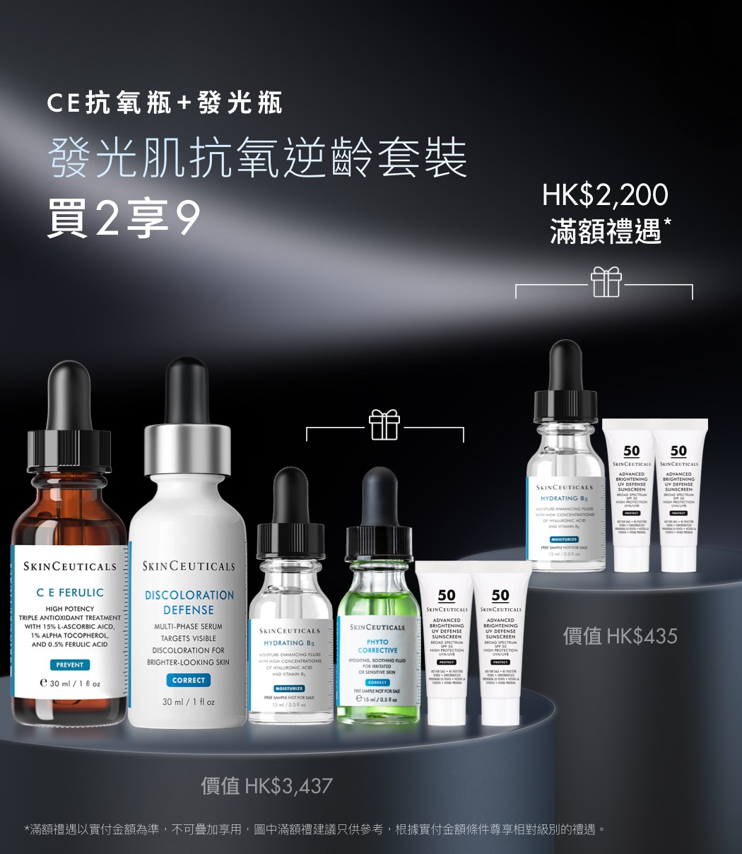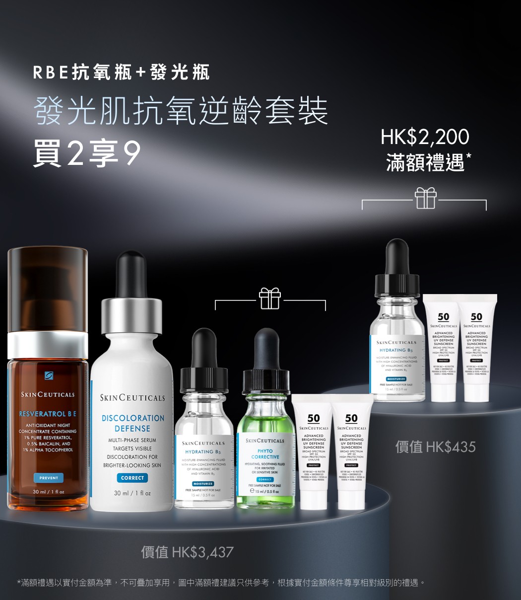發光肌抗氧逆齡套裝含高效亮肌祛斑精華30ml及自選抗氧化精華30ml,禮贈水合維他命B5精華15ml,舒緩修護精華15ml及雙效淡斑防曬霜 SPF 50 3ml*2。