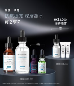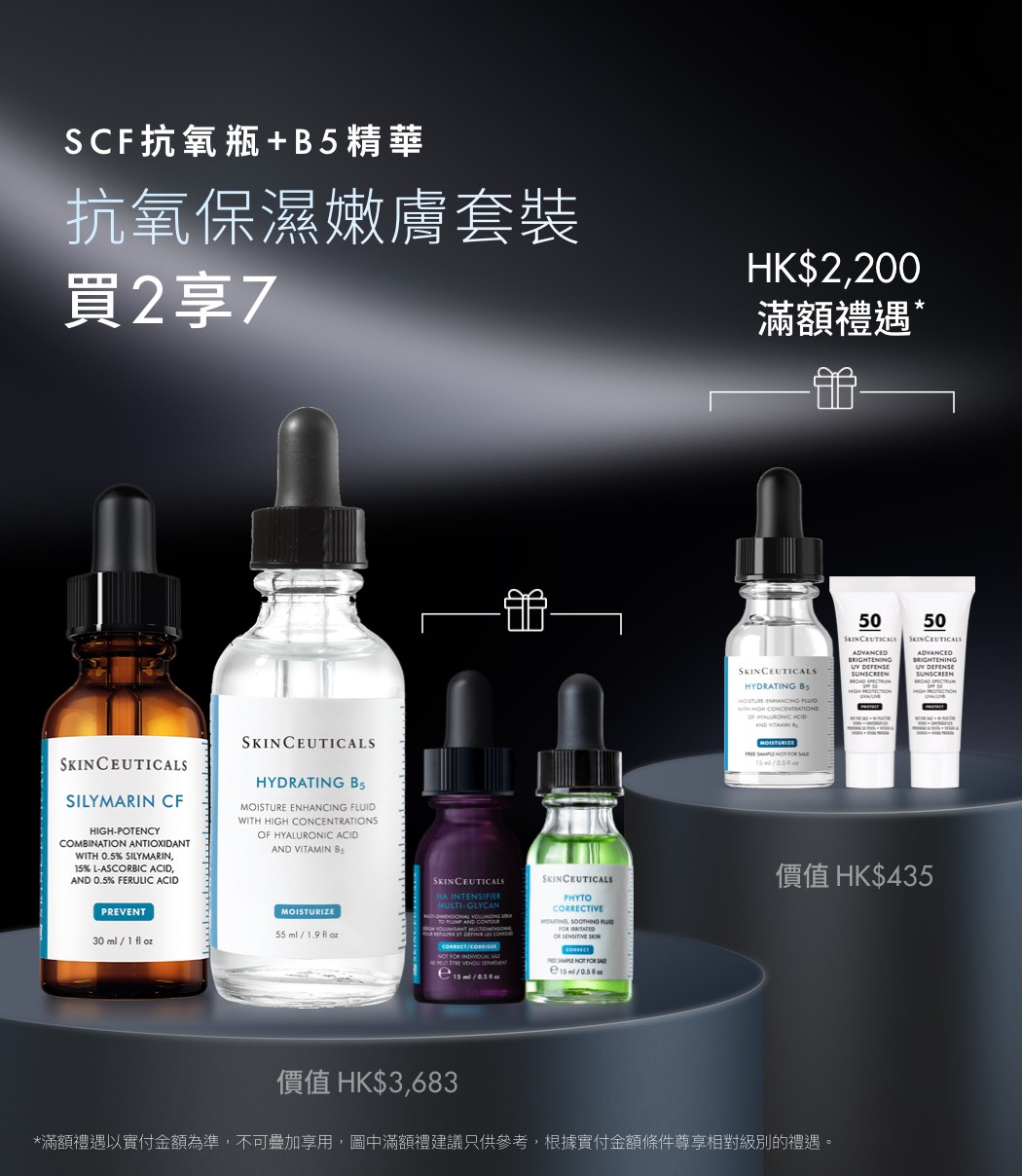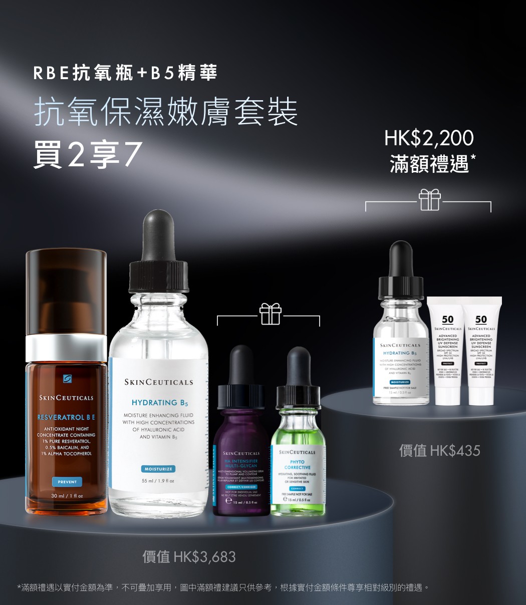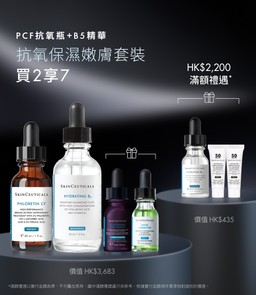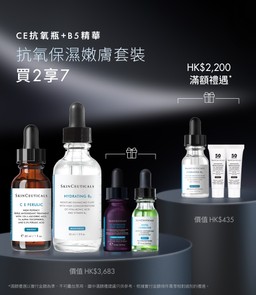 抗氧保濕嫩膚套裝含水合維他命B5精華55ml及自選抗氧化精華30ml,禮贈H.A.多重飽滿緊緻精華15ml及舒緩修護精華15ml。