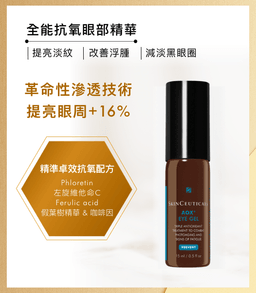 蘊含phloretin、左旋維他命C及ferulic acid,這款集保護及改善於一身的serum-in-a-gel精華能為脆弱的眼部肌膚提供光老化保護。
