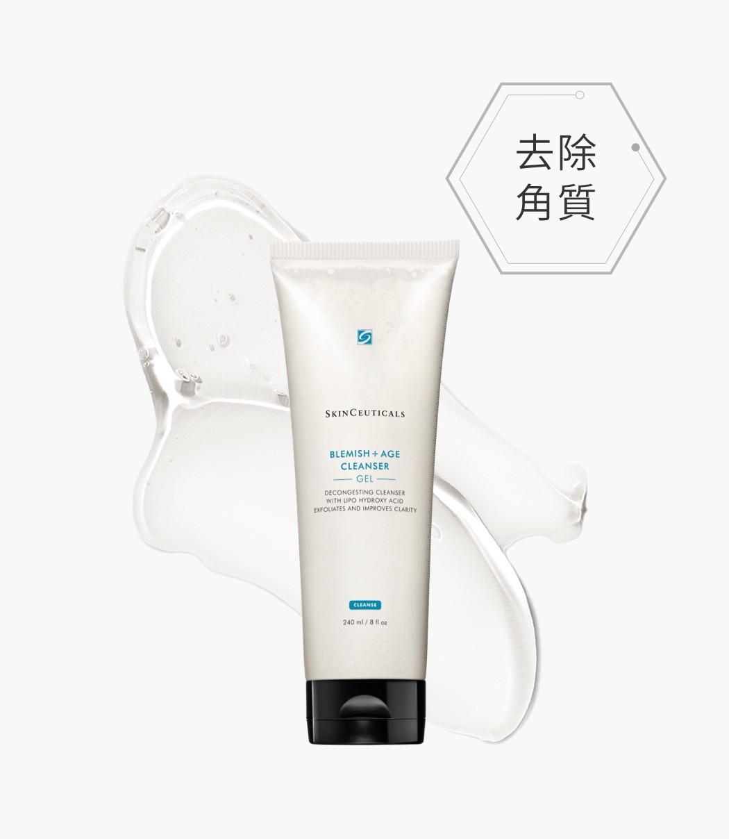淨化再生雙效潔面啫喱Blemish + AGE Cleanser,具有針對性去角質潔面成份,結合LHA,甘醇酸,水楊酸,甘油及山梨醇,淨化多餘油份及卸妝,更可改善毛孔閉塞、明亮膚色。潔面啫喱結合高效潔膚成分包括LHA、甘醇酸及水楊酸,改善毛孔閉塞、撫平粗糙及明亮膚色。配方為有暗瘡的成熟皮膚而設,深層潔淨並收細毛孔,同時不會使皮膚乾燥。