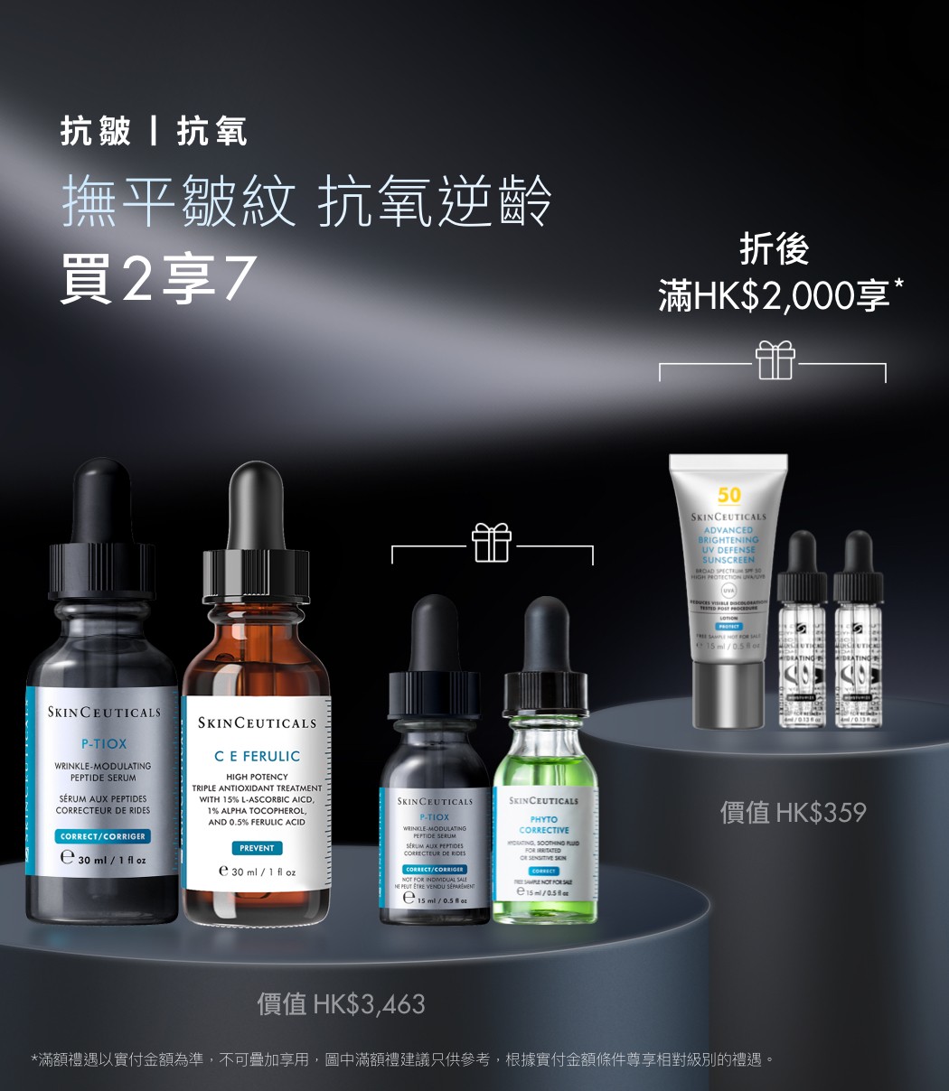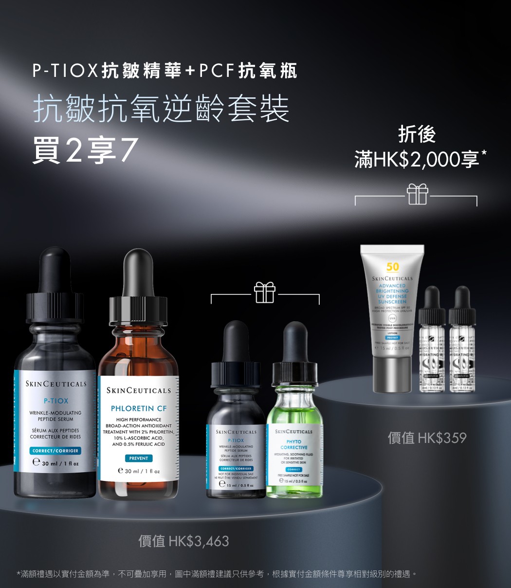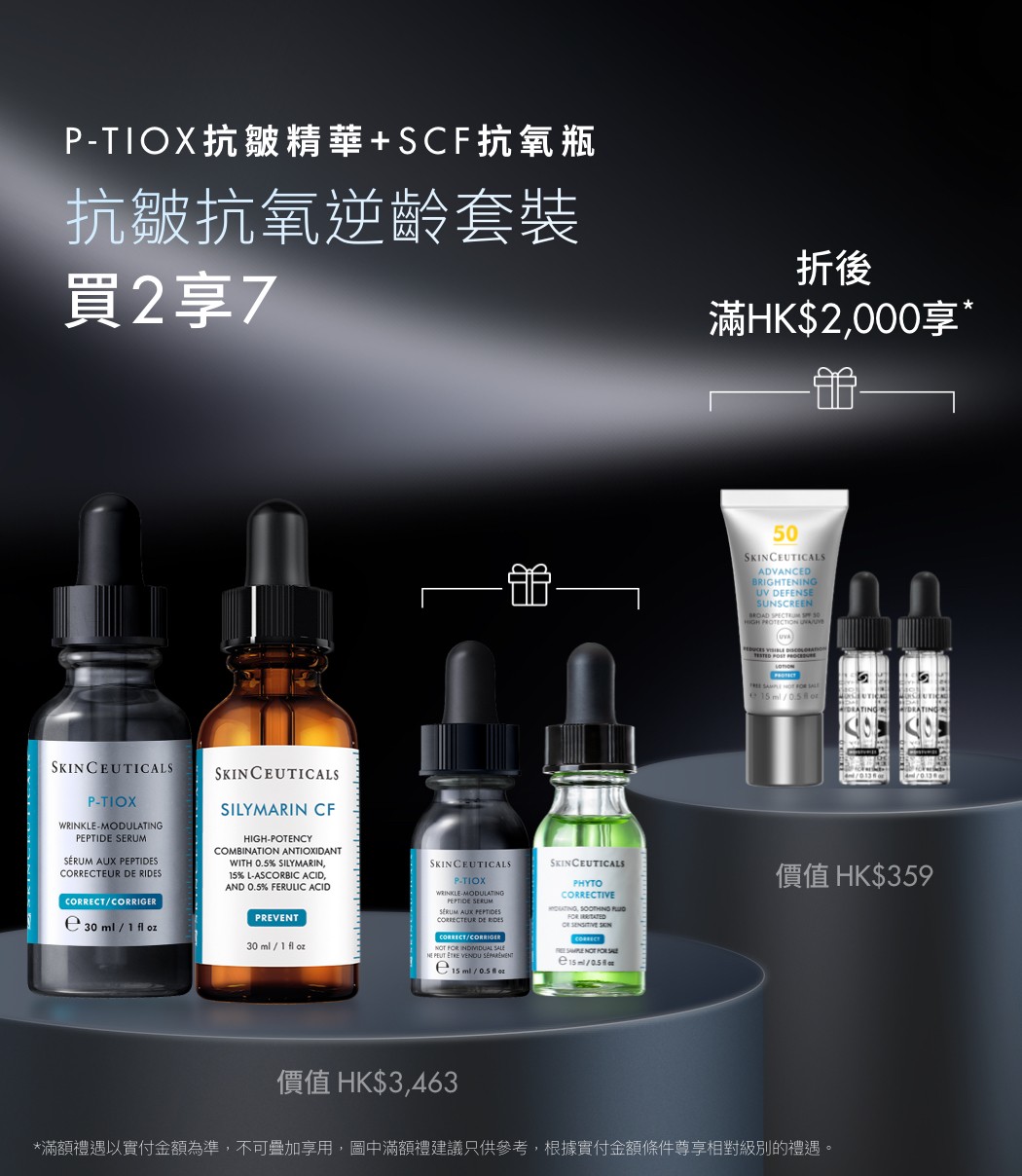 【網店限定】抗皺抗氧逆齡套裝含P-TIOX胜肽抗皺精華30ml及自選抗氧化精華30ml ,禮贈胜肽抗皺精華15ml及舒緩修護精華15ml。